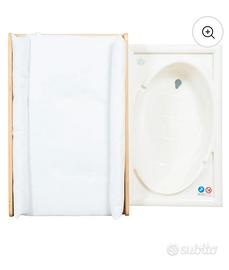 Il fasciatoio, morbidamente imbottito (83x51cm) con bordi di sicurezza e superficie in PU lavabile e delicata per la pelle del bambino, è incluso. La vasca misura circa 60x35cm e ha un volume di 10litri, consentendo un comodo bagno, dopo il quale il bambino può essere immediatamente trasferito sul piano di cambio. L'acqua può essere facilmente scaricata grazie al pratico tubo di scarico, senza dover trasportare la vasca. Il fasciatoio è inoltre dotato di due scomparti in tessuto che offrono ampio spazio per riporre pannolini, cosmetici e altri oggetti essenziali.