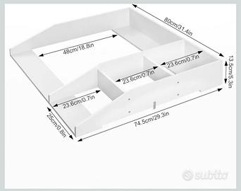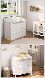 Fasciatoio da montare su cassettiera, universale, perfetto per i modelli Ikea Malm e Hemnes, come si vede dalle foto. Vendo perché doppio regalo, la confezione è ancora sigillata. È provvisto di un sistema di fissaggio a muro per evitare il ribaltamento della cassettiera. Come da foto dell'articolo in vendita su Amazon è bianco, ha una parte per il materassino di grande dimensione ed uno spazio di "contenitori" per disporre creme, salviette e pannolini.