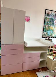Vendo arredi bianchi e rosa cameretta bambini Ikea in ottimo stato: armadio 60x57x181 due ante e tre cassetti, fasciatoio trasformabile in scrivania 90x79x100 tre cassetti.