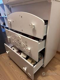 VENDO fasciatoio Foppapedretti , usato ma in buone condizioni, dotato di vaschetta estraibile, tre ampi cassetti, piano ribaltabile e pratico materassino. I cassetti sono decorati con divertenti e teneri orsetti giocherelloni e tante stelline, le maniglie sono a forma di stella. Ha ruote gommate antigraffio, con sistema frenante, per facilitare gli spostamenti.