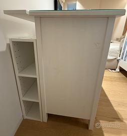 Vendesi cassettiera hemnes (ikea) con 8 cassetti (misure 160 x 96 cm), bianco, con copertura in vetro, pomelli a forma di nuvola marca Zara home, + 2 scaffali salva spazio da riporre dietro + fasciatoio con imbotttitura, rivestimento e paracolpi. Ottime condizioni .