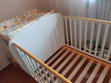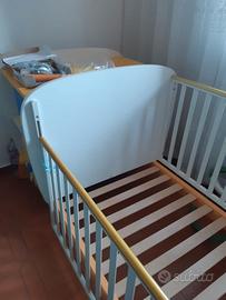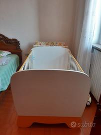 Modello trasformabile, accompagna il bambino dall'infanzia all'adolescenza, può essere allungato senza aggiungere altri elementi, e diventare un comodo letto singolo, mentre il fasciatoio si trasforma in un piccolo scrittoio ed in un comodino con due cassettoni. bianco con particolari arancio e zafferano,