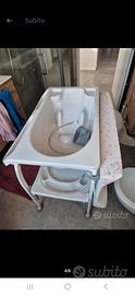 fasciatoio Brevi. con Vasca per primi bagnetti, scomparti per accessori. pieghevole. altezza adatta x essere stoccato sopra il bidet. 4 ruote girevoli 460o con bloccaggio. H 100cmx larghezza 80 cm x profondità 50 cm. altezza sopra bidet 39 cm. materassino scucito in un lato e alcuni bordi pelati