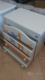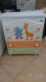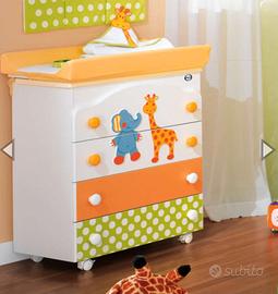 Mobile multifunzione che include vaschetta anatomica per il bagnetto e un piano fasciatoio superiore. Struttura: Dotato di 3 ampi cassetti e ruote piroettanti per facilitare lo spostamento. Dimensioni: Le misure del mobile sono circa 90x75x45 Caratteristiche: Il piano superiore è dotato di coperchio ribaltabile con blocco di sicurezza.
