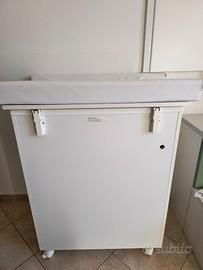 Fasciatoio dotato di vaschetta per fare anche il bagnetto. Misure: H 99cm ( compreso di cuscinetto) L 72cm Pr 45.5 cm. Come si nota dalle foto gli angoli del cuscino sono un po' scucite, c'è una piccola macchia di olio per il bagnetto nel primo cassetto. Per il resto è tenuto molto bene.