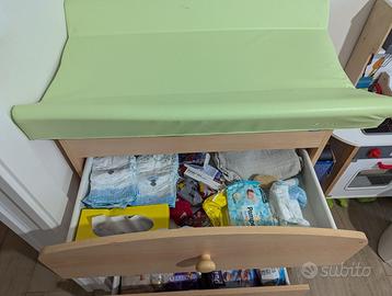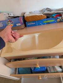 Un comodo e solido fasciatoio in stile legno, con una vaschetta integrata per il bagnetto.