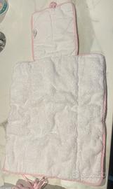 Morbido fasciatoio imbottito da viaggio con orsetto rosa in buone condizioni. Vendo insieme a un portaponnolini coordinato con scomparto per salviettine per cambio pannolini. Lavabili entrambi in lavatrice.