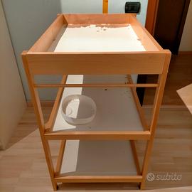 Fasciatoio in legno naturale, simil ikea, ma di misure (piano d'appoggio interno, in cui si posa il bambino) 49,5 x 79,5 cm. Ha i tre piano d'appoggio rovinati perché si è levato lo smalto bianco. Credo si possano dipingere o rivestire di carta impermeabile. Regalo inoltre il materassino morbido, rovinato solo un angolo come fa foto. RITIRO A MIO DOMICILIO (GIÀ MONTATO - CREMA) SE SPEDISCO DEVO SMONTARE TUTTO