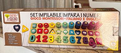 Gioco Montessori. Set impilabile impara i numeri. Italiano/inglese. Prodotto da Teorema giochi per passione. Eta’ consigliata dai 3 in su. Interamente in legno. € 10.