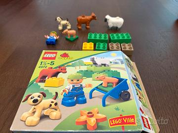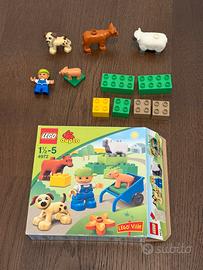 Lego Duplo Mini fattoria degli animali con bambino con cappello, cagnolino, mucca, pecorella, maialino, pezzi di lego differenti. In confezione manca il carretto blu che si vede sulla scatola. Sul profilo trovi diverse altre confezioni Duplo a prezzi incredibili, guarda tutte le inserzioni.