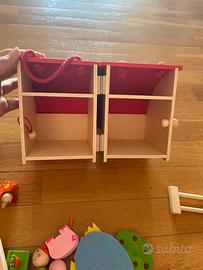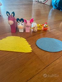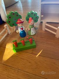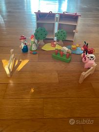 Fattoria giocattolo completamente in legno in ottusissime condizioni Comprende: 1 fattoria 1 contadino 1 contadina 1 cavallo 1 mucca 1 maiale 1 pecora 1 anatra 1 gallina 2 tapettini in feltro giallo e azzurro 1 carote 2 recinti 2 alberi