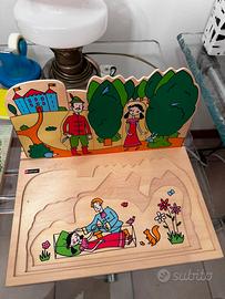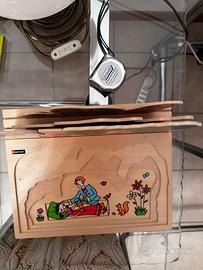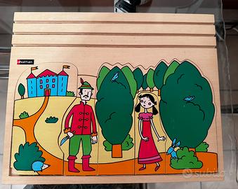 Favola in 3D Biancaneve e i 7 nani. Realizzata in legno cm 32x26x2h. Completa di tutti in tasselli per completare la favola. Ogni fase della favola è un piano in legno. C’è il cacciatore, il bosco, la casetta dei nani, la mela, la strega ed infine il principe.