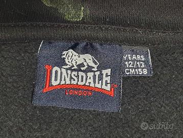 Felpa con zip lunga e cappuccio, marca Lonsdale originale, colore nero maculato militare, in 60% cotone e 40% Poliestere, taglia 12-13 anni, 158 cm, con 2 tasche esterne, in discrete condizioni (si segnala la "L" del marchio sul petto leggermente staccata e la mancanza della lettera "L" di London).