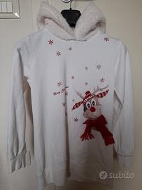 Felpa di Natale, cm 152, con tasche, cappuccio di pellicola ecologica, in cotone 100% felpato, con renna, con cappellino con brillantini, naso e sciarpa in rilievo.