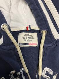 Bellissima felpa originale Fred Mello New York per ragazzo, colore blu navy con dettagli bianchi. Caratterizzata da apertura full-zip, cappuccio foderato e iconica stampa "Westside" sul davanti. Il tessuto è 100% cotone di alta qualità, caldo e traspirante, con interno leggermente felpato. Capo dallo stile sportivo e intramontabile, perfetto per la scuola e il tempo libero. Condizioni ottime.