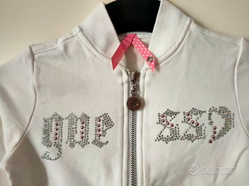 felpa Guess bianca con due tasche laterali,maniche con polsini, chiusura a zip.davanti sul petto applicata decorazione con strass.