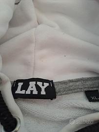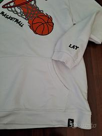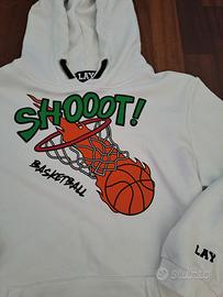 Felpa leggera del brand Lay, di colore bianco, con una divertente stampa a tema basket. - Taglia XL, adatta per 14 anni. - Design con cappuccio e tasca frontale. - Stampa SHOOOOT! con canestro e pallone da basket. - 75% cotone - ottime condizioni