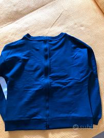 Vendo felpa blu Monnalisa, con zip lato posteriore che si apre dal basso, logo sul lato anteriore e strisce bianche sulle maniche. Mai indossata. Per bambina età 12 anni.