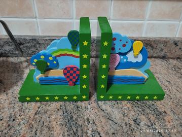 Fermalibri a forma di mongolfiere: un set di due fermalibri in legno. (uno dei due fermalibri è leggermente usurato in due angoli.