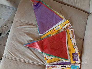 15 confezioni di festoni per feste, (classiche bandierine) ogni confezione contiene un festone è lungo 10 metri. Vedi foto