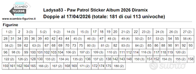Set 10 Figurine Paw Patrol Sticker Album 2026 Diramix da scegliere tra quelle presenti nella lista in foto La lista contiene 113 Figurine Univoche su 181 Doppie. L'intera raccolta è composta da 180 Figurine. Album non in vendita Se non si effettua la scelta, verranno inviate 10 Figurine a caso (diverse tra loro). Possibilità di creare set personalizzati con numero maggiore di figurine, al costo di 0,40 € a figurina. Sconti per acquisti multipli. Lista doppie disponibili in seconda foto oppure qui: 1(2),2,3(3),5(2),9(2),14(3),15(3),17,18,19,20,21(2),22,23(2),24(3),26(3),27(2),28,31,34,35,36,39,40,42,43,44,45(3),46(3),47,48(3),49(4),50(2),51,53(2),54,55,56(4),58(2),59,62,63(3),67,68,69,70,73,75,80(3),81(2),82,83(5),84(2),85,86,88,90,91,92,93,96,98(3),99,100,101,102,103,104,106(2),107(2),109(3),110(2),111,112,114,116(3),117,118,119,120(2),122(2),126(2),128,130,133(2),134(4),135(2),136,137(2),138,142,143,148,150(3),151,152,154(3),155(2),158,159,161,162,164,165,166(2),167(2),168,169,171(2),172,174,175,180(2) Nuove. Casa non fumatori.