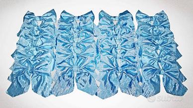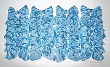 Privato vende fiocchi di colore celeste di dimensioni 25 x 25 cm, artigianali realizzati con tessuto taftà stropicciato senza orlatura.
