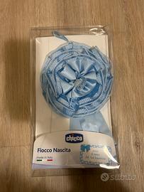 Fiocco nascita azzurro marca Chicco. Vedere particolare di uno dei prolungamenti del fiocco: sembra rovinato ma li c’era il biglietto con il nome