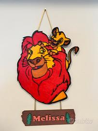 Porta un tocco di magia e dolcezza nella cameretta del tuo bimbo/a con questa splendita targhetta o fiocco nascita da appendere dietro la porta, raffigurante il re leone. Realizzata in legno e dipinta a mano.