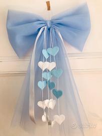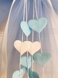 Fiocco nascita artigianale in tulle azzurro con cuori pendenti bianchi e azzurri. Elegante e delicato, perfetto per annunciare la nascita di un bimbo o decorare la cameretta. Realizzato a mano con cura.