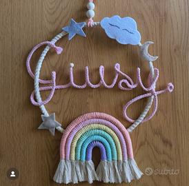 Fiocco nascita con nome personalizzato da poter tenere sempre in camera o fuori la porta. Interamente fatto a mano
