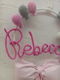 Fiocco nascita interamente fatto a mano all'uncinetto. La struttura interna del cerchio è metallo, rivestito in tricotin, come pure il nome. Le decorazioni sono tutte realizzate con tecnica amigurumi. Stoffa e filati sono in cotone 100%. Possibilità di realizzarlo con nome a richiesta. Per qualsiasi info e/o richieste sui progetti all' uncinetto contattami 😀👍🙋👋