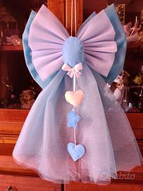 fiocco nascita azzurro e bianco glitterato con applicazione di aquilone di palloncino in feltro.
