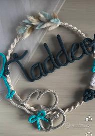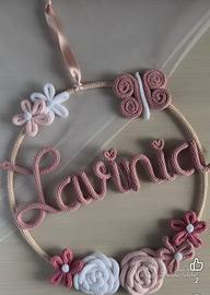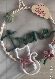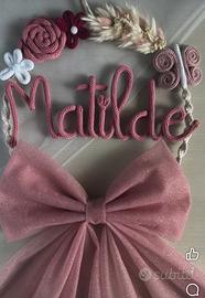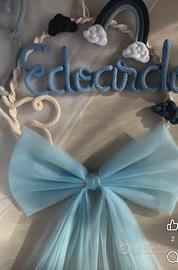 Eseguo fiocco nascita personalizzato, esempi come da foto, possiamo personalizzarlo insieme con calori e forme diverse in base alle preferenze. Prezzo base 16€ solo cerchio con nome e piccole decorazioni come nelle foto dell annuncio. 25€ completo con fiocco in tulle.