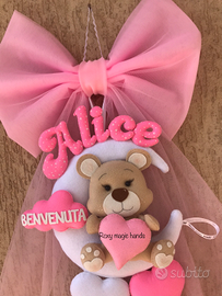 Realizzò fiocchi nascita in pannolenci con diversi personaggi. Questo nelle foto ha un orsetto dolcissimo. Si può personalizzare anche al maschile. Prima di ordinare contattatemi per mettere a punto tutti i dettagli