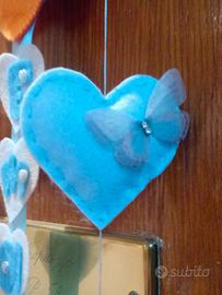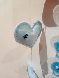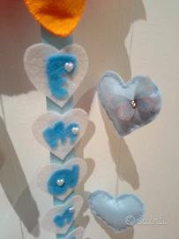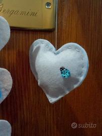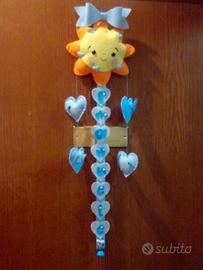 Grazioso fiocco nascita oppure regalo di nascita. Adattabile come fuori porta o nella cameretta del bimbo. Rappresentato da un sole , cuori , coccinelle e farfalle. Il nome e il sesso del bambino/a è personalizzabile. Realizzato interamente a mano. Disegnato ✏ ritagliato ✂ cucito a mano In morbido pannolenci Per maggiori informazioni per la scelta del nome e colore contattare con un messaggio Mi trovate anche su pagina Facebook ed Instagram con nome Dolce Venus Creative