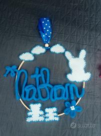 realizzo fiocchi nascita personalizzati, questi in foto sono esempi 18 euro. Prezzo variabile in base alle richieste. Possono essere usati anche come decorazione per le camerette dei vostri bimbi.