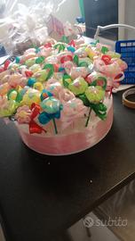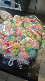 fiori confezionati con caramelle gommose . per eventi come nascite, battesimi, compleanni e tanti altri eventi. al costo di 1.50cadauno.