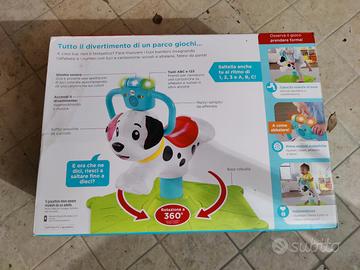 Questo cagnolino da cavalcare è un concentrato di canzoncine, suoni e frasi educative da imparare saltellando e girando in tondo. Dove entra in gioco lo sviluppo Nozioni di base: Quando il vostro bambino saltella o preme i pulsanti, le allegre canzoncine e le frasi gli insegnano l’alfabeto, i numeri, i colori e tanto altro. Capacità motorie di base: salire sul cagnolino e saltellare su e giù aiuta il vostro bambino a rinforzare l’equilibrio e la coordinazione. Capacità di esprimersi e fiducia in sè stessi: salendo e scendendo dal cagnolino, i bambini scoprono come saltellare e volteggiare da soli, sentendosi indipendenti È dolce, non lascia peli in giro per la casa e non sporca! Con il Cagnolino Saltella e Gira Fisher-Price potrete far avverare il desiderio del vostro bambino di avere un amico a quattro zampe, perfetto per imparare tante cose nuove giocando. Con la sua base robusta, le pratiche impugnature, i pulsanti interattivi e le luci colorate, questo cagnolino da cavalcare è un concentrato di canzoncine, suoni e frasi educative da imparare saltellando e girando in tondo!