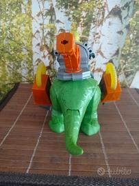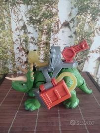 Set di giocattoli Fisher Price Imaginext con dinosauro triceratopo con sella e personaggio.