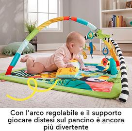 Gioco distesi sul pancino: l'arco regolabile con fantasia ad alto contrasto può essere riposizionato per avvicinare i giocattoli, mentre il cuscino di supporto a forma di giraffa offre maggiore comfort al bambino