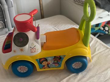 Tocca la tastiera illuminata e scopri 5 musiche diverse; puoi anche creare la tua musica premendo i tasti colorati del pianoforte oppure suonando la tromba, il tamburo e i piatti. Il sedile si solleva e rivela un vano per riporre oggetti o giochi.