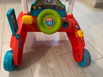 Primi Passi al Volante Fisher-Price è un giocattolo per l'apprendimento interattivo che 'cresce' insieme al tuo bambino e lo accompagna dalla posizione seduta fino a quando sarà in grado di sollevarsi e compiere i suoi primi passi. Questo primi passi ispirato a una macchina consente ai più piccoli di alzarsi in piedi e spingerlo da entrambi i lati grazie alle pratiche ruote Steady Speed, per un'andatura lenta adatta ai più piccoli. Entrambi i lati offrono attività entusiasmanti, tra cui un cruscotto interattivo e il volante per 'guidare' durante il gioco di finzione. Inoltre, i 3 livelli di gioco Smart Stages aiutano a insegnare l'alfabeto, i contrari e a contare man mano che i piccoli conducenti crescono e 'guidano' in giro per casa. Utilizza il pulsante a forma di globo per scegliere la lingua: italiano, spagnolo, portoghese o inglese.