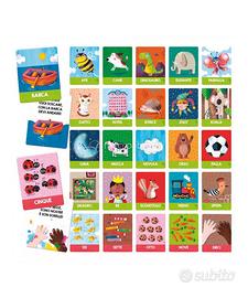 Grazie a 36 carte grandi e robuste adatte ad essere maneggiate daipiù piccoli,il bambino impara a riconoscere parole, numeri e forme.