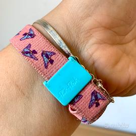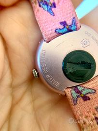 Rosa, con uccelli azzurri. Cassa dimensioni 25mm, cinturino lungo 21,5cm. Funzionante e con batteria carica.