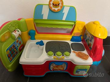 Furgoncino con allegre melodie (in italiano e in inglese), piano cottura dove appoggiare le cose per cucinare e 2 fornelli che riproducono suoni realistici.