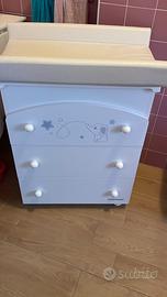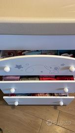 Il cassetto superiore è decorato con un dolce elefantino in rilievo e tante stelline, le maniglie hanno forma tonda a pallina. Ha 4 ruote piroettanti, di cui due con freno, per facilitare gli spostamenti.