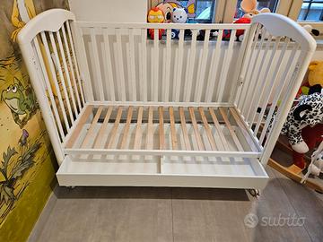 Vendo lettino Foppapedretti con Sponda a Scomparsa modello Patty. Rete a doghe di faggio, ampio cassetto regolabile a doppia altezza, 4 ruote, misure 131x73x108 cm, bianco.