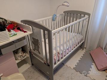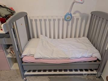Foppapedretti Lettino con Sponda a Scomparsa My Little Love, legno di Faggio, Made in Italy, Rete a Doghe di Faggio Regolabile a Doppia Altezza. Anche la sponda è regolabile a due altezze, per facilitare il riordino del lettino, che può anche essere abbassata a scomparsa per la versione a divanetto. con ampio cassetto contenitore, 4 ruote, 131x73x108 cm, Bianco/grigio.