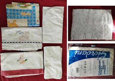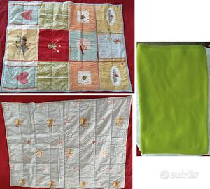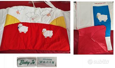 Lettino (senza materasso), cassettiera/fasciatoio con vaschetta per il bagnetto dei primi mesi (nel primo cassetto qualche macchia di olio per bambini), tre mensole (n.2 da 100x25 cm, n.1 da 80x25 cm), paracolpi coordinato con piumone e copripiumone/copriletto, Aerosleep antisoffoco, n.2 cuscini, n.2 lenzuolini sotto con angoli, n.3 completi lenzuolo sopra con federa, n.1 trapuntina double face e n.1 copertina in pile verde, n.1 cuscino allattamento/gioco. Tutto in ottime condizioni. Attualmente il lettino è smontato. Non spedisco.