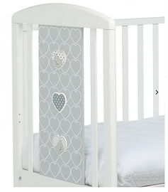 Una delle testate del lettino ha decorazioni con teneri cuori in rilievo che racchiudono un dolcissimo orsetto. Il lettino ha un ampio cassetto inferiore, suddiviso in due scomparti, e ruote gommate antigraffio, con sistema frenante, per facilitare gli spostamenti.